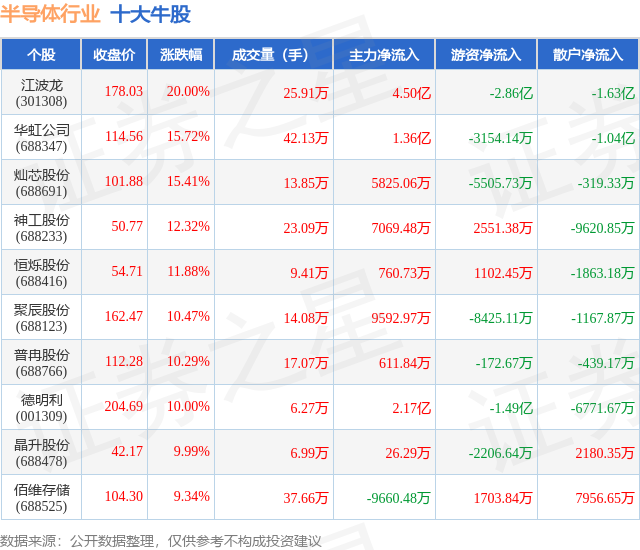 个股表现方面,半导体行业当日领涨股为江波龙(301308),该股当日报收178.03,上涨20.0%,成交量25.91万,主力资金净流入4.5亿元。华虹公司(688347)以上涨15.72%紧随其后,该股当日成交量42.13万,主力资金净流入1.36亿元。除此之外,灿芯股份(688691)、神工股份(688233)、恒烁股份(688416)均进入当日牛股之列。具体个股列表见下表: