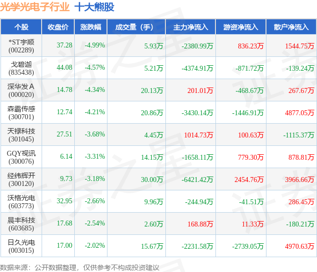个股表现方面,光学光电子行业当日领跌股为*ST宇顺(002289),该股当日报收37.28,下跌4.99%,成交量5.93万,主力资金净流出2380.99万元。戈碧迦(835438)以下跌4.57%紧随其后,该股当日成交量5.21万,主力资金净流出4374.91万元。除此之外,深华发A(000020)、森霸传感(300701)、天禄科技(301045)均进入当日熊股之列。具体个股列表见下表: