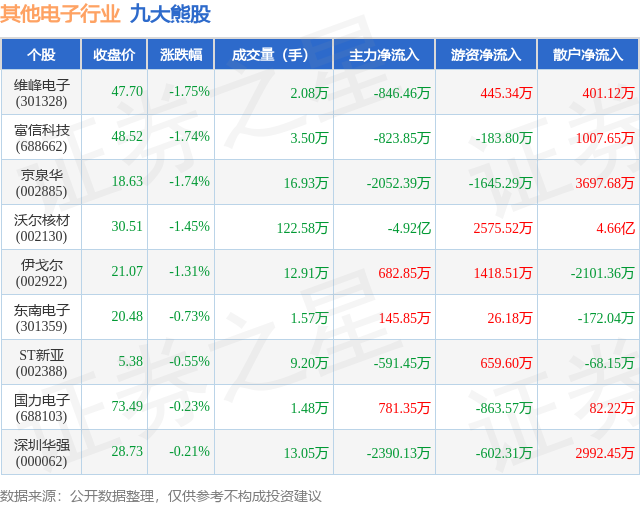 个股表现方面,其他电子行业当日领跌股为维峰电子(301328),该股当日报收47.7,下跌1.75%,成交量2.08万,主力资金净流出846.46万元。富信科技(688662)以下跌1.74%紧随其后,该股当日成交量3.5万,主力资金净流出823.85万元。除此之外,京泉华(002885)、沃尔核材(002130)、伊戈尔(002922)均进入当日熊股之列。具体个股列表见下表:
