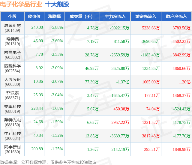 个股表现方面,电子化学品行业当日领跌股为思泉新材(301489),该股当日报收240.0,下跌5.88%,成交量4.78万,主力资金净流出9022.15万元。唯特偶(301319)以下跌2.6%紧随其后,该股当日成交量7.19万,主力资金净流出811.58万元。除此之外,宏昌电子(603002)、西陇科学(002584)、天通股份(600330)均进入当日熊股之列。具体个股列表见下表: