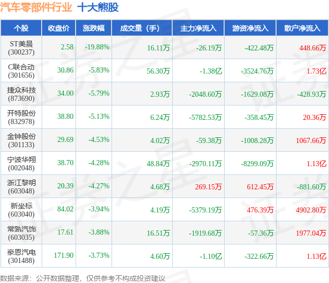 个股表现方面,汽车零部件行业当日领跌股为ST美晨(300237),该股当日报收2.58,下跌19.88%,成交量16.11万,主力资金净流出26.19万元。C联合动(301656)以下跌5.83%紧随其后,该股当日成交量56.3万,主力资金净流出1.38亿元。除此之外,捷众科技(873690)、开特股份(832978)、金钟股份(301133)均进入当日熊股之列。具体个股列表见下表: