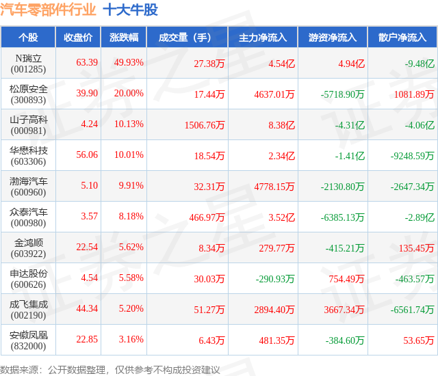 个股表现方面,汽车零部件行业当日领涨股为N瑞立(001285),该股当日报收63.39,上涨49.93%,成交量27.38万,主力资金净流入4.54亿元。松原安全(300893)以上涨20.0%紧随其后,该股当日成交量17.44万,主力资金净流入4637.01万元。除此之外,山子高科(000981)、华懋科技(603306)、渤海汽车(600960)均进入当日牛股之列。具体个股列表见下表: