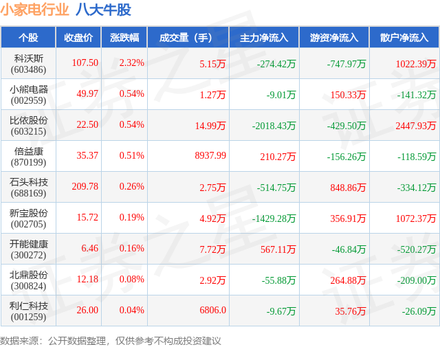 个股表现方面,小家电行业当日领涨股为科沃斯(603486),该股当日报收107.5,上涨2.32%,成交量5.15万,主力资金净流出274.42万元。小熊电器(002959)以上涨0.54%紧随其后,该股当日成交量1.27万,主力资金净流出9.01万元。除此之外,比依股份(603215)、倍益康(870199)、石头科技(688169)均进入当日牛股之列。具体个股列表见下表: