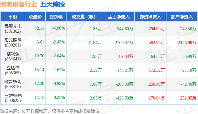 个股表现方面,照明设备行业当日领跌股为民爆光电(301362),该股当日报收42.11,下跌4.9%,成交量1.83万,主力资金净流出544.6万元。阳光照明(600261)以下跌2.43%紧随其后,该股当日成交量31.84万,主力资金净流出2709.97万元。除此之外,格利尔(831641)、立达信(605365)、欧普照明(603515)均进入当日熊股之列。具体个股列表见下表: