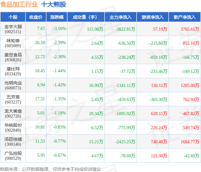 个股表现方面,食品加工行业当日领跌股为金字火腿(002515),该股当日报收7.67,下跌3.16%,成交量115.98万,主力资金净流出3822.81万元。味知香(605089)以下跌2.39%紧随其后,该股当日成交量2.64万,主力资金净流出636.5万元。除此之外,盖世食品(836826)、康比特(833429)、光明肉业(600073)均进入当日熊股之列。具体个股列表见下表: