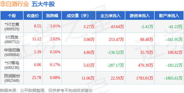 个股表现方面,非白酒行业当日领涨股为*ST兰黄(000929),该股当日报收8.55,上涨3.01%,成交量3.27万,主力资金净流入43.64万元。ST西发(000752)以上涨2.02%紧随其后,该股当日成交量3.08万,主力资金净流入253.47万元。除此之外,中信尼雅(600084)、*ST椰岛(600238)、百润股份(002568)均进入当日牛股之列。具体个股列表见下表: