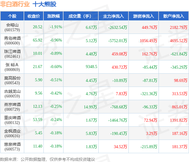 个股表现方面,非白酒行业当日领跌股为会稽山(601579),该股当日报收20.52,下跌1.91%,成交量6.67万,主力资金净流出2632.54万元。青岛啤酒(600600)以下跌0.96%紧随其后,该股当日成交量5.12万,主力资金净流出5752.01万元。除此之外,珠江啤酒(002461)、张 裕A(000869)、莫高股份(600543)均进入当日熊股之列。具体个股列表见下表: