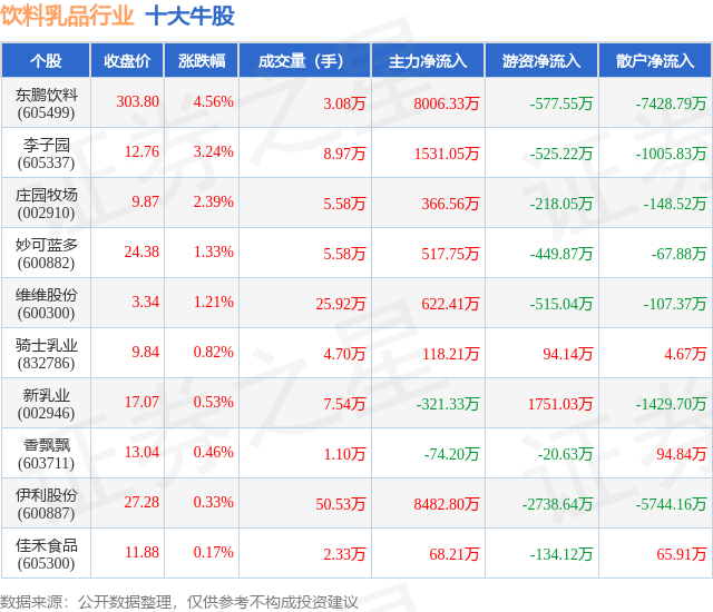 个股表现方面,饮料乳品行业当日领涨股为东鹏饮料(605499),该股当日报收303.8,上涨4.56%,成交量3.08万,主力资金净流入8006.33万元。李子园(605337)以上涨3.24%紧随其后,该股当日成交量8.97万,主力资金净流入1531.05万元。除此之外,庄园牧场(002910)、妙可蓝多(600882)、维维股份(600300)均进入当日牛股之列。具体个股列表见下表: