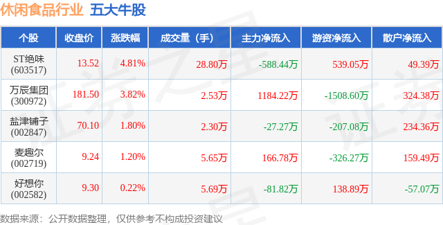 个股表现方面,休闲食品行业当日领涨股为ST绝味(603517),该股当日报收13.52,上涨4.81%,成交量28.8万,主力资金净流出588.44万元。万辰集团(300972)以上涨3.82%紧随其后,该股当日成交量2.53万,主力资金净流入1184.22万元。除此之外,盐津铺子(002847)、麦趣尔(002719)、好想你(002582)均进入当日牛股之列。具体个股列表见下表: