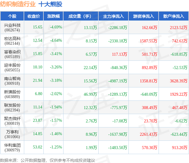 个股表现方面,纺织制造行业当日领跌股为兴业科技(002674),该股当日报收15.65,下跌4.69%,成交量13.11万,主力资金净流出2286.18万元。宏达高科(002144)以下跌4.64%紧随其后,该股当日成交量8.15万,主力资金净流出2330.18万元。除此之外,富春染织(605189)、迎丰股份(605055)、南山智尚(300918)均进入当日熊股之列。具体个股列表见下表: