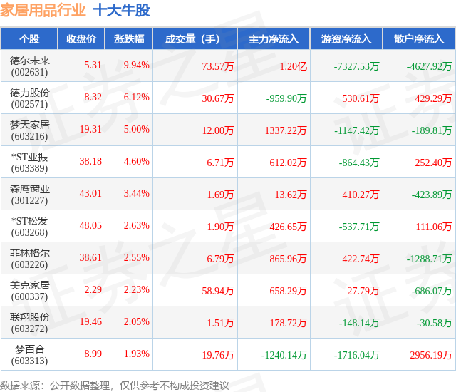 个股表现方面,家居用品行业当日领涨股为德尔未来(002631),该股当日报收5.31,上涨9.94%,成交量73.57万,主力资金净流入1.2亿元。德力股份(002571)以上涨6.12%紧随其后,该股当日成交量30.67万,主力资金净流出959.9万元。除此之外,梦天家居(603216)、*ST亚振(603389)、森鹰窗业(301227)均进入当日牛股之列。具体个股列表见下表: