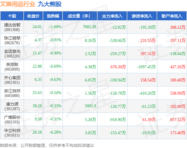 个股表现方面,文娱用品行业当日领跌股为通达创智(001368),该股当日报收24.01,下跌1.6%,成交量7682.0,主力资金净流出12.82万元。珠江钢琴(002678)以下跌0.91%紧随其后,该股当日成交量8.26万,主力资金净流出528.66万元。除此之外,金运激光(300220)、英派斯(002899)、齐心集团(002301)均进入当日熊股之列。具体个股列表见下表: