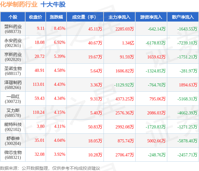 个股表现方面,化学制药行业当日领涨股为盟科药业(688373),该股当日报收9.11,上涨8.45%,成交量45.11万,主力资金净流入2285.69万元。永安药业(002365)以上涨6.92%紧随其后,该股当日成交量40.67万,主力资金净流入1.34亿元。除此之外,京新药业(002020)、圣诺生物(688117)、泽璟制药(688266)均进入当日牛股之列。具体个股列表见下表: