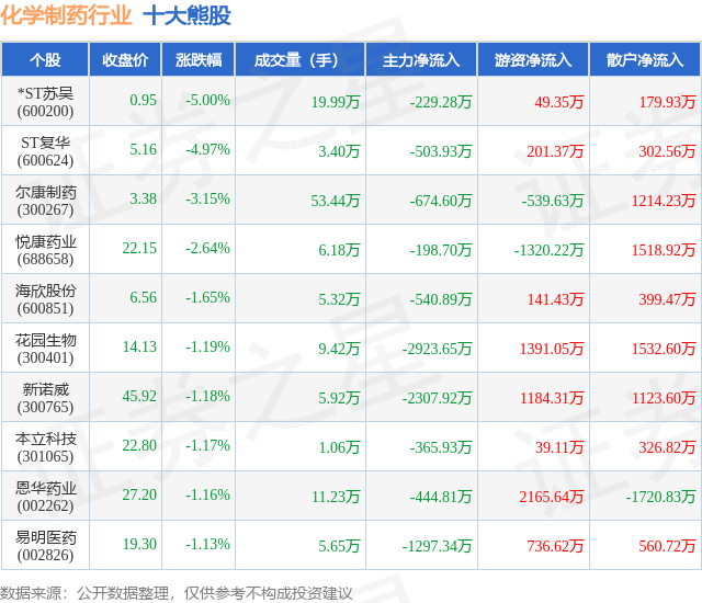 个股表现方面,化学制药行业当日领跌股为*ST苏吴(600200),该股当日报收0.95,下跌5.0%,成交量19.99万,主力资金净流出229.28万元。ST复华(600624)以下跌4.97%紧随其后,该股当日成交量3.4万,主力资金净流出503.93万元。除此之外,尔康制药(300267)、悦康药业(688658)、海欣股份(600851)均进入当日熊股之列。具体个股列表见下表: