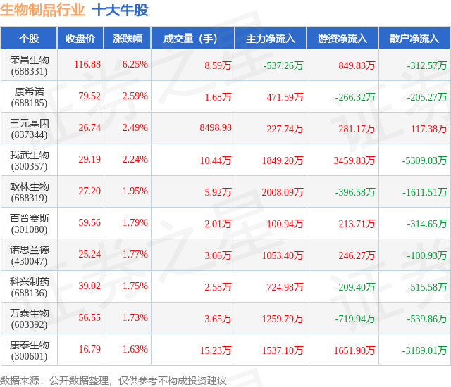 个股表现方面,生物制品行业当日领涨股为荣昌生物(688331),该股当日报收116.88,上涨6.25%,成交量8.59万,主力资金净流出537.26万元。康希诺(688185)以上涨2.59%紧随其后,该股当日成交量1.68万,主力资金净流入471.59万元。除此之外,三元基因(837344)、我武生物(300357)、欧林生物(688319)均进入当日牛股之列。具体个股列表见下表: