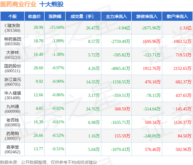 个股表现方面,医药商业行业当日领跌股为C建发致(301584),该股当日报收28.99,下跌15.04%,成交量26.47万,主力资金净流出1.04亿元。柳药集团(603368)以下跌1.89%紧随其后,该股当日成交量8.57万,主力资金净流出2759.49万元。除此之外,大参林(603233)、国药股份(600511)、浙江震元(000705)均进入当日熊股之列。具体个股列表见下表: