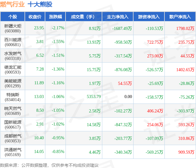 个股表现方面,燃气行业当日领跌股为新疆火炬(603080),该股当日报收23.95,下跌2.17%,成交量8.92万,主力资金净流出1687.49万元。百川能源(600681)以下跌1.55%紧随其后,该股当日成交量13.93万,主力资金净流出958.5万元。除此之外,水发燃气(603318)、德龙汇能(000593)、美能能源(001299)均进入当日熊股之列。具体个股列表见下表: