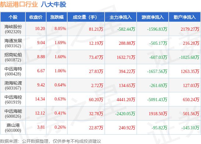 个股表现方面,航运港口行业当日领涨股为海峡股份(002320),该股当日报收10.2,上涨8.05%,成交量81.21万,主力资金净流出582.44万元。海通发展(603162)以上涨1.69%紧随其后,该股当日成交量12.19万,主力资金净流入288.88万元。除此之外,招商轮船(601872)、中远海特(600428)、渤海轮渡(603167)均进入当日牛股之列。具体个股列表见下表: