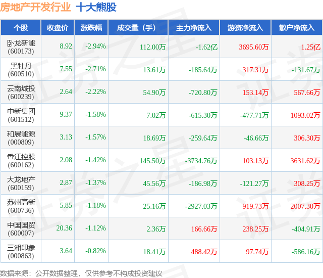 个股表现方面,房地产开发行业当日领跌股为卧龙新能(600173),该股当日报收8.92,下跌2.94%,成交量112.0万,主力资金净流出1.62亿元。黑牡丹(600510)以下跌2.71%紧随其后,该股当日成交量13.61万,主力资金净流出185.64万元。除此之外,云南城投(600239)、中新集团(601512)、和展能源(000809)均进入当日熊股之列。具体个股列表见下表: