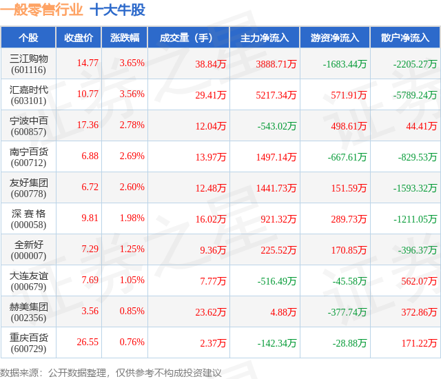 个股表现方面,一般零售行业当日领涨股为三江购物(601116),该股当日报收14.77,上涨3.65%,成交量38.84万,主力资金净流入3888.71万元。汇嘉时代(603101)以上涨3.56%紧随其后,该股当日成交量29.41万,主力资金净流入5217.34万元。除此之外,宁波中百(600857)、南宁百货(600712)、友好集团(600778)均进入当日牛股之列。具体个股列表见下表: