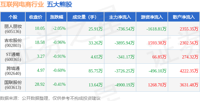 个股表现方面,互联网电商行业当日领跌股为丽人丽妆(605136),该股当日报收10.05,下跌2.05%,成交量25.91万,主力资金净流出736.54万元。吉宏股份(002803)以下跌0.96%紧随其后,该股当日成交量33.26万,主力资金净流出3895.94万元。除此之外,ST通葡(600365)、跨境通(002640)、国联股份(603613)均进入当日熊股之列。具体个股列表见下表: