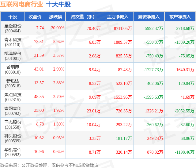 个股表现方面,互联网电商行业当日领涨股为星徽股份(300464),该股当日报收7.74,上涨20.0%,成交量70.4万,主力资金净流入8711.05万元。青木科技(301110)以上涨5.94%紧随其后,该股当日成交量6.83万,主力资金净流入1889.57万元。除此之外,凯淳股份(301001)、若羽臣(003010)、新迅达(300518)均进入当日牛股之列。具体个股列表见下表: