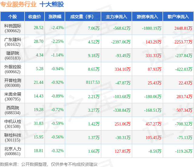 个股表现方面,专业服务行业当日领跌股为科锐国际(300662),该股当日报收28.52,下跌2.43%,成交量7.06万,主力资金净流出568.62万元。广东建科(301632)以下跌2.25%紧随其后,该股当日成交量4.52万,主力资金净流出2397.06万元。除此之外,建研院(603183)、外服控股(600662)、开普检测(003008)均进入当日熊股之列。具体个股列表见下表: