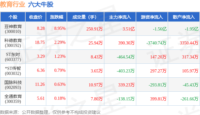 个股表现方面,教育行业当日领涨股为豆神教育(300010),该股当日报收8.28,上涨8.95%,成交量250.91万,主力资金净流入3.51亿元。科德教育(300192)以上涨2.29%紧随其后,该股当日成交量25.94万,主力资金净流入390.3万元。除此之外,ST东时(603377)、*ST传智(003032)、国脉科技(002093)均进入当日牛股之列。具体个股列表见下表:
