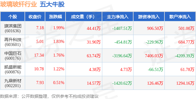 个股表现方面,玻璃玻纤行业当日领涨股为旗滨集团(601636),该股当日报收7.18,上涨1.99%,成交量44.41万,主力资金净流出1407.51万元。再升科技(603601)以上涨1.83%紧随其后,该股当日成交量31.9万,主力资金净流出454.81万元。除此之外,中国巨石(600176)、凯盛新能(600876)、九鼎新材(002201)均进入当日牛股之列。具体个股列表见下表: