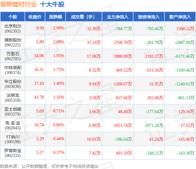 个股表现方面,装修建材行业当日领涨股为北京利尔(002392),该股当日报收9.99,上涨2.99%,成交量32.3万,主力资金净流出784.77万元。濮耐股份(002225)以上涨2.08%紧随其后,该股当日成交量37.19万,主力资金净流入2768.78万元。除此之外,万里石(002785)、中铁装配(300374)、华立股份(603038)均进入当日牛股之列。具体个股列表见下表: