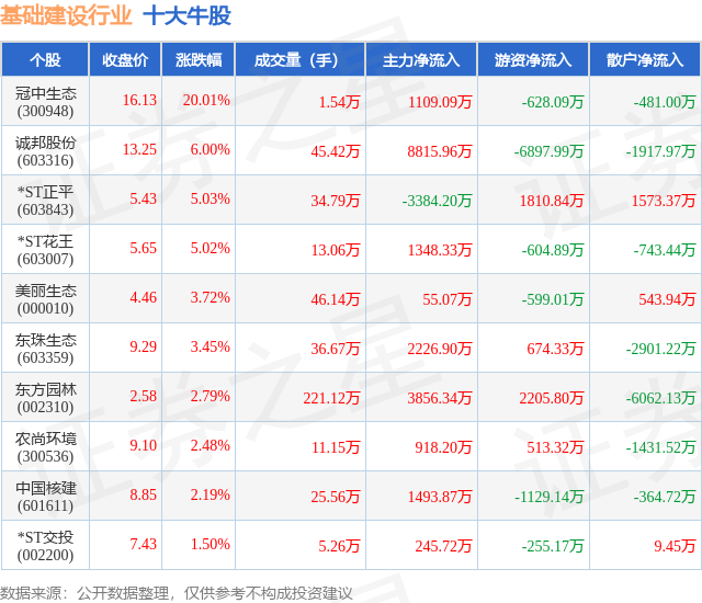个股表现方面,基础建设行业当日领涨股为冠中生态(300948),该股当日报收16.13,上涨20.01%,成交量1.54万,主力资金净流入1109.09万元。诚邦股份(603316)以上涨6.0%紧随其后,该股当日成交量45.42万,主力资金净流入8815.96万元。除此之外,*ST正平(603843)、*ST花王(603007)、美丽生态(000010)均进入当日牛股之列。具体个股列表见下表:
