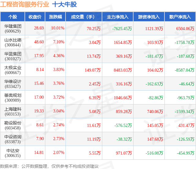 个股表现方面,工程咨询服务行业当日领涨股为华建集团(600629),该股当日报收28.69,上涨10.01%,成交量70.25万,主力资金净流出7625.45万元。山水比德(300844)以上涨7.1%紧随其后,该股当日成交量3.04万,主力资金净流入1654.85万元。除此之外,华蓝集团(301027)、太极实业(600667)、华维设计(833427)均进入当日牛股之列。具体个股列表见下表:
