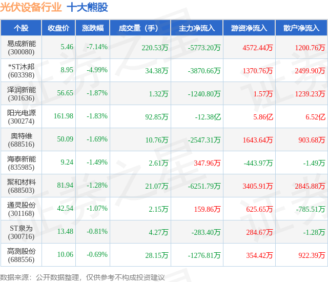 个股表现方面,光伏设备行业当日领跌股为易成新能(300080),该股当日报收5.46,下跌7.14%,成交量220.53万,主力资金净流出5773.2万元。*ST沐邦(603398)以下跌4.99%紧随其后,该股当日成交量34.38万,主力资金净流出3870.66万元。除此之外,泽润新能(301636)、阳光电源(300274)、奥特维(688516)均进入当日熊股之列。具体个股列表见下表: