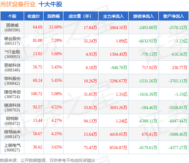 个股表现方面,光伏设备行业当日领涨股为固德威(688390),该股当日报收64.69,上涨12.68%,成交量17.84万,主力资金净流入5064.1万元。德业股份(605117)以上涨7.28%紧随其后,该股当日成交量32.24万,主力资金净流入1.89亿元。除此之外,*ST金刚(300093)、昱能科技(688348)、帝科股份(300842)均进入当日牛股之列。具体个股列表见下表: