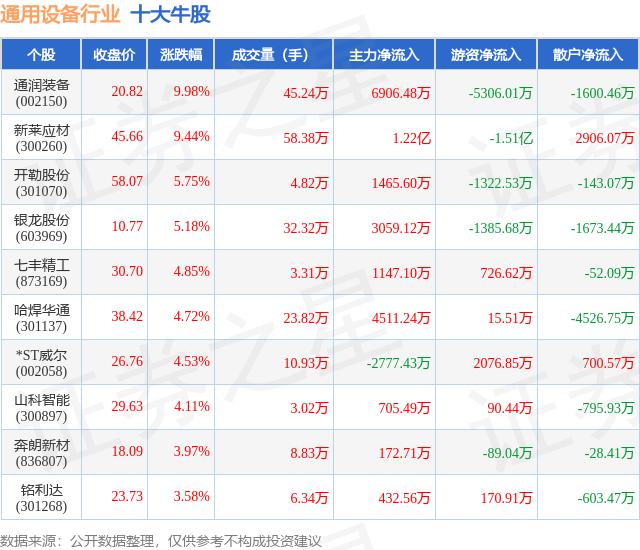 个股表现方面,通用设备行业当日领涨股为通润装备(002150),该股当日报收20.82,上涨9.98%,成交量45.24万,主力资金净流入6906.48万元。新莱应材(300260)以上涨9.44%紧随其后,该股当日成交量58.38万,主力资金净流入1.22亿元。除此之外,开勒股份(301070)、银龙股份(603969)、七丰精工(873169)均进入当日牛股之列。具体个股列表见下表: