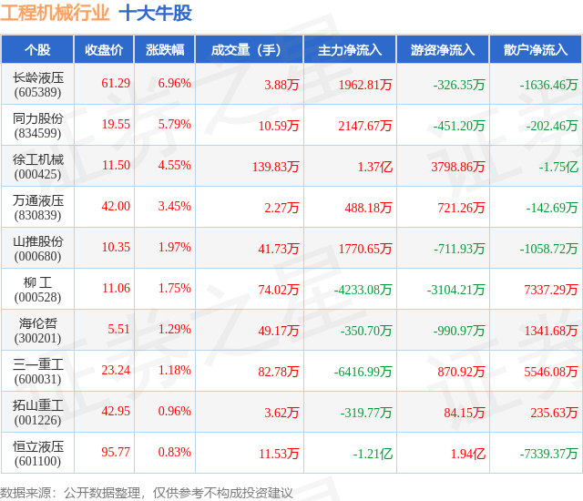 个股表现方面,工程机械行业当日领涨股为长龄液压(605389),该股当日报收61.29,上涨6.96%,成交量3.88万,主力资金净流入1962.81万元。同力股份(834599)以上涨5.79%紧随其后,该股当日成交量10.59万,主力资金净流入2147.67万元。除此之外,徐工机械(000425)、万通液压(830839)、山推股份(000680)均进入当日牛股之列。具体个股列表见下表: