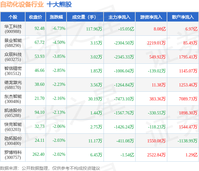 个股表现方面,自动化设备行业当日领跌股为华工科技(000988),该股当日报收92.48,下跌6.73%,成交量117.96万,主力资金净流出15.05亿元。景业智能(688290)以下跌4.5%紧随其后,该股当日成交量3.15万,主力资金净流出2304.5万元。除此之外,众辰科技(603275)、智信精密(301512)、德龙激光(688170)均进入当日熊股之列。具体个股列表见下表: