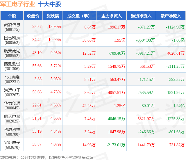 个股表现方面,军工电子行业当日领涨股为高凌信息(688175),该股当日报收25.57,上涨13.9%,成交量6.84万,主力资金净流入1996.17万元。国睿科技(600562)以上涨10.0%紧随其后,该股当日成交量36.63万,主力资金净流入1.95亿元。除此之外,航天南湖(688552)、西测测试(301306)、*ST奥维(002231)均进入当日牛股之列。具体个股列表见下表: