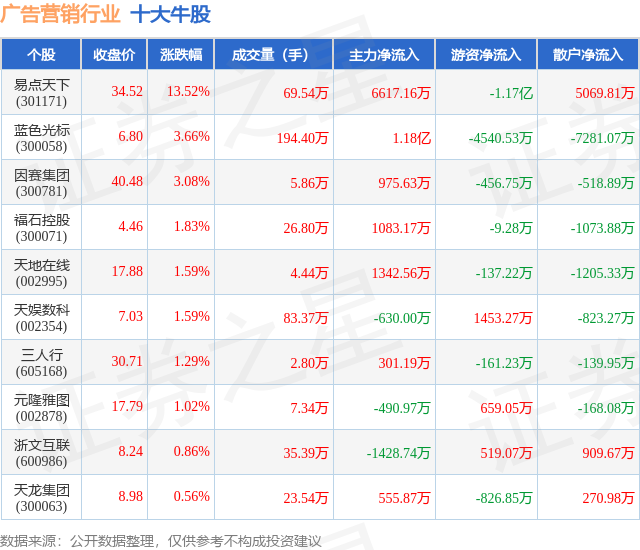 个股表现方面,广告营销行业当日领涨股为易点天下(301171),该股当日报收34.52,上涨13.52%,成交量69.54万,主力资金净流入6617.16万元。蓝色光标(300058)以上涨3.66%紧随其后,该股当日成交量194.4万,主力资金净流入1.18亿元。除此之外,因赛集团(300781)、福石控股(300071)、天地在线(002995)均进入当日牛股之列。具体个股列表见下表: