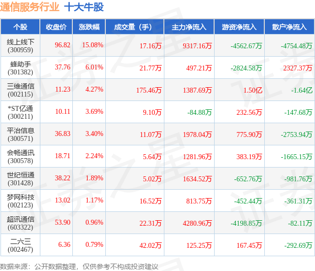 个股表现方面,通信服务行业当日领涨股为线上线下(300959),该股当日报收96.82,上涨15.08%,成交量17.16万,主力资金净流入9317.16万元。蜂助手(301382)以上涨6.01%紧随其后,该股当日成交量21.77万,主力资金净流入497.21万元。除此之外,三维通信(002115)、*ST亿通(300211)、平治信息(300571)均进入当日牛股之列。具体个股列表见下表: