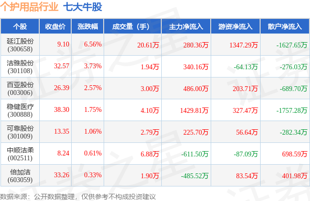 个股表现方面,个护用品行业当日领涨股为延江股份(300658),该股当日报收9.1,上涨6.56%,成交量20.61万,主力资金净流入280.36万元。洁雅股份(301108)以上涨3.73%紧随其后,该股当日成交量1.94万,主力资金净流入340.16万元。除此之外,百亚股份(003006)、稳健医疗(300888)、可靠股份(301009)均进入当日牛股之列。具体个股列表见下表: