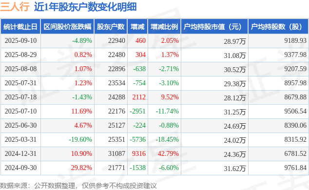从股价来看,2025年8月29日至2025年9月10日,三人行区间跌幅为4.89%,在此期间股东户数增加460.0户,增幅为2.05%。