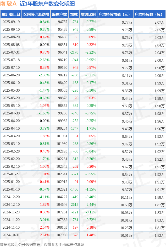 从股价来看,2025年8月20日至2025年9月19日,南 玻A区间跌幅为1.67%,在此期间股东户数减少1679.0户,减幅为1.74%。