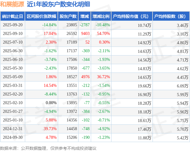 从股价来看,2025年9月10日至2025年9月20日,和展能源区间跌幅为14.84%,在此期间股东户数减少2787.0户,减幅为10.48%。