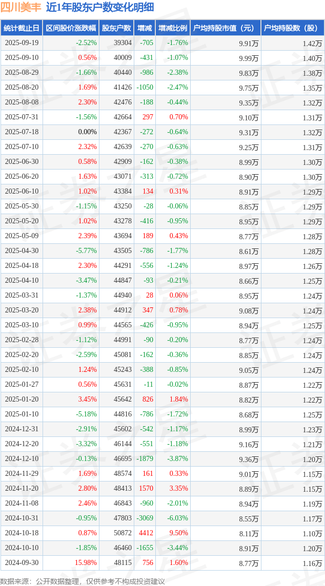 从股价来看,2025年9月10日至2025年9月19日,四川美丰区间跌幅为2.52%,在此期间股东户数减少705.0户,减幅为1.76%。