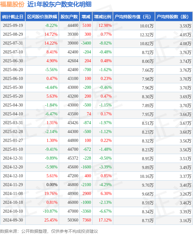 从股价来看,2025年8月29日至2025年9月19日,福星股份区间跌幅为8.22%,在此期间股东户数增加5100.0户,增幅为12.98%。