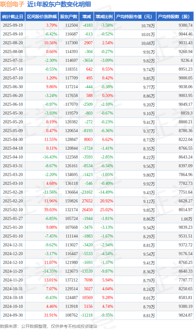 从股价来看,2025年9月10日至2025年9月19日,联创电子区间涨幅为3.79%,在此期间股东户数减少4183.0户,减幅为3.58%。