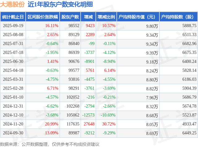 从股价来看,2025年8月8日至2025年9月19日,大港股份区间涨幅为16.11%,在此期间股东户数增加9423.0户,增幅为10.57%。