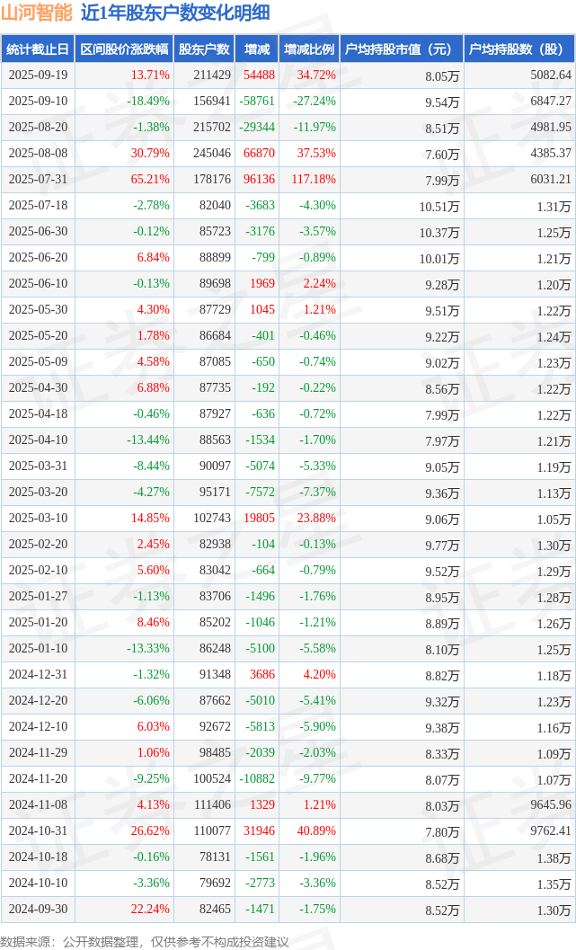 从股价来看,2025年9月10日至2025年9月19日,山河智能区间涨幅为13.71%,在此期间股东户数增加5.45万户,增幅为34.72%。