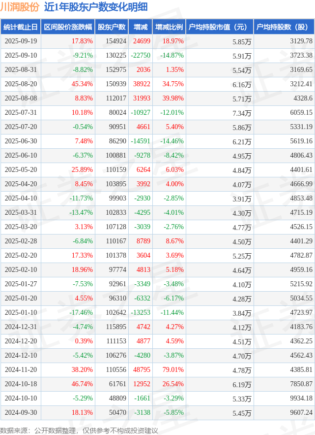 从股价来看,2025年9月10日至2025年9月19日,川润股份区间涨幅为17.83%,在此期间股东户数增加2.47万户,增幅为18.97%。